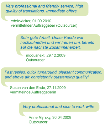 Zudem umfangreiche Erfahrung im Übersetzen von Verträgen, Allgemeinen Geschäftsbedingungen, gesellschaftsrechtlichen Dokumenten, Finanzmarkttexten, Jahresabschlüssen, Geschäftsberichten, GuVs, Lageberichten (betrachtet man die beiden Bereiche finanzwirtschaftliche Texte und Rechnungslegung nach IFRS/HGB zusammengenommen, hat sie dort Projekte im Gesamtumfang von etwa 280.000 Wörtern abgewickelt, Stand: Februar 2012) etc. im freiberuflichen Umfeld gesammelt.